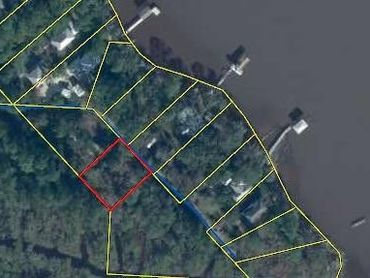 Arial view of vacant lot 308 Joy Lane. Private non-thru road that ends at the Bay/Bayou. Bayou to Bay access in back of land. Lots of nature, mature trees, and bay breezes. Peaceful. Parcel ID: